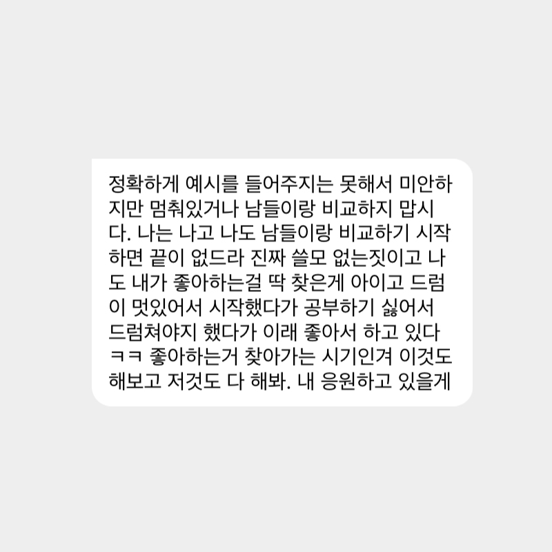 2021년 10월 16일 토요일도개걸윷오늘은 레슨 갔다왔어 드럼레슨오전 02:28도개걸윷4시간동안 쌤이랑 얘기 나눴는데오전 02:28도개걸윷너무 좋은걸 말씀해주시더라고오전 02:28도개걸윷공유하고 싶어서 연락해오전 02:29도개걸윷너가 힘든거 싹다 나열하고 그걸 정해 앞으로 어떻게 해나갈지오전 02:30도개걸윷해결한다기보다는 그냥 컨셉을 어떻게 잡고 갈지라는 느낌이 좀 더 비슷하겠다.오전 02:30도개걸윷하..이걸 예시를 들어야 이해가 딱 갈텐데오전 02:32도개걸윷내 껄로 예시를 들수가 없어가지구 너무 현실적이라서ㅋㅋㅋㅋㅋ오전 02:33도개걸윷한번 들어보자면오전 02:34도개걸윷아 진짜 비밀이다 너네오전 02:34도개걸윷이거 리얼 찐인데오전 02:35도개걸윷아니당ㅋㅋㅋㅋㅋㅋㅋ오전 02:36도개걸윷아니 ..
