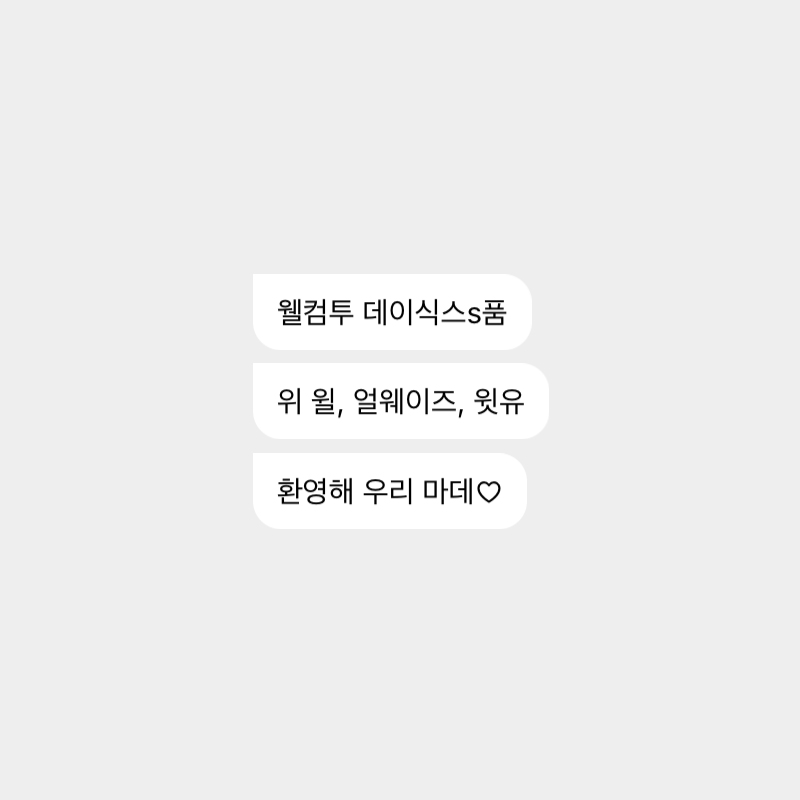2024년 1월 4일 목요일도개걸윷잘지내구있지?오후 07:51 도개걸윷나도 잘지내고 있는데오후 07:51 도개걸윷용왕신과의 원만한 합의가 좀 필요할거같다오후 07:51 도개걸윷어떡해 나?오후 07:53 도개걸윷진짜 서울 못가 이제?오후 07:53 도개걸윷아 그나저나 마이데이 4기 모집인가??오후 07:54 도개걸윷웰컴투 데이식스s품오후 07:56 도개걸윷위 윌, 얼웨이즈, 윗유오후 07:56 도개걸윷환영해 우리 마데♡오후 07:59 도개걸윷뭐 또 재밌는 얘기 없나?오후 07:59 도개걸윷우리 다같이 큐앤에이 해보까??오후 07:59 도개걸윷내가 세월을 낚는썰이라는분오후 08:00 도개걸윷내가 서울을 못올라올거라는 분오후 08:00 도개걸윷많은 분들이 벌써부터 나 놀릴생각으로..